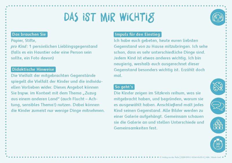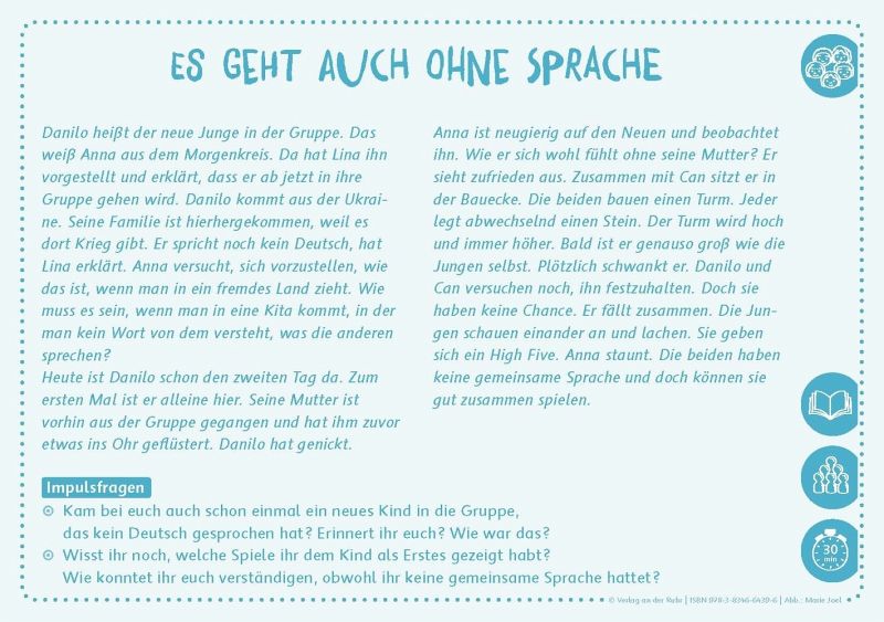 Karten-Set mit Impulsen zu Diversity und Inklusion für den Einsatz in Kita und Kindergarten+++Das Kita-Leben ist so vielseitig wie unsere Gesellschaft: lebhafte Kinder, schüchterne Kinder, Kinder mit verschiedenen Muttersprachen, Kinder mit Behinderungen oder aus verschiedenen Familienkonstellationen. Auch im Kita-Team und in der Elternschaft ist die Realität divers. Doch der Umgang mit der Vielfalt in der Kita kann herausfordernd sein. Wie gelingt aber ein positiver Blick auf die Unterschiede als wertvolle Ressource, als "Superkraft"?Informatives Begleitheft: Ob Begrifflichkeiten, eigene Haltung oder Herausforderungen im Team - das Begleitheft zu den Bildkarten liefert wertvolle Hinweise und Hintergrundwissen.32 Bildkarten: Spiel- und Bastelangebote, Impulsgeschichten und didaktische Hinweise rund um Themen wie Gefühle, Kooperation, Selbst- und Fremdwahrnehmung. Die Bildkarten können in kleinen oder größeren Gruppen, als Einzel-Impuls oder in der Projektarbeit eingesetzt werden.Dieses Karten-Set zu Diversität in der Kita unterstützt Sie dabei, in Ihrer Kita eine Pädagogik der Vielfalt zu fördern und so zu einer inklusiven Gesellschaft beizutragen, an der alle selbstverständlich teilhaben - so wie sie sind.