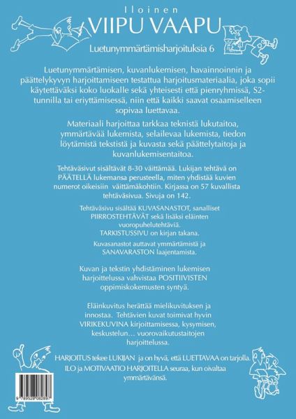 Viipu Vaapu luetunymmärtämistehtäviä 6 kirja on luetunymmärtämisen, havainnoin ja päättelykyvyn harjoittamiseen testattua harjoitusmateriaalia, joka sopii käytettäväksi koko luokalle sekä yhteisesti että pienryhmissä, S2-tunnilla ja eriyttämisessä, niin että kaikki saavat osaamiselleen sopivaa luettavaa. Materiaali harjoittaa tarkkaa teknistä lukutaitoa, ymmärtävää lukemista, selailevaa lukemista, tiedon löytämistä tekstistä ja kuvasta sekä päättelytaitoja ja kuvanlukemisentaitoa. Tehtäväsivut sisältävät 8-30 väittämää. Lukijan tehtävä on päätellä lukemansa perusteella, miten yhdistää kuvien numerot oikeisiin väittämäkohtiin. Kirjassa on 57 kuvallista tehtäväsivua. Sivuja on 142.