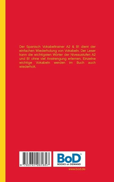 Der Spanisch Vokabeltrainer A2 & B1 dient der einfachen Wiederholung von Vokabeln. Der Leser kann die wichtigsten Wörter der Niveaustufen A2 und B1 ohne viel Anstrengung erlernen. Einzelne wichtige Vokabeln werden im Buch vereinzelt auch wiederholt. Noch zu festigende Vokabeln brauchen nicht mühevoll nachgeschlagen werden. Sie können sich durch Ausschlussverfahren einzelne Vokabeln aneignen oder die Übersetzungen auf derselben Seite unten nachlesen. Einige Wörter und Wortteile sind fett abgedruckt. Dies zeigt in der Regel einen etymologischen Zusammenhang auf und erleichtert das Lernen.