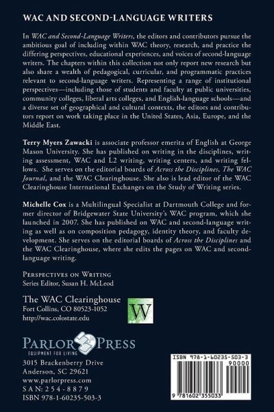 Perspectives on Writing Series, Edited by Susan H. McLeod. WAC Clearinghouse and Parlor Press In WAC AND SECOND-LANGUAGE WRITERS: RESEARCH TOWARDS LINGUISTICALLY AND CULTUR¬ALLY INCLUSIVE PROGRAMS AND PRACTICES, the editors and contributors pursue the ambitious goal of including within WAC theory, research, and practice the differing perspectives, educational experiences, and voices of second-language writers. The chapters within this collection not only report new research but also share a wealth of pedagogical, curricular, and programmatic practices relevant to second-language writers. Representing a range of institutional perspectives-including those of students and faculty at public universities, community colleges, liberal arts colleges, and English-language schools-and a diverse set of geographical and cultural contexts, the editors and contributors report on work taking place in the United States, Asia, Europe, and the Middle East. TERRY MYERS ZAWACKI is associate professor emerita of English at George Mason University. She has published on writing in the disciplines, writing assessment, WAC and L2 writing, writing centers, and writing fellows. She serves on the editorial boards of Across the Disciplines, The WAC Journal, and the WAC Clearinghouse. She also is lead editor of the WAC Clearinghouse International Exchanges on the Study of Writing series. MICHELLE COX is a Multilingual Specialist at Dartmouth College and former director of Bridgewater State University's WAC program, which she launched in 2007. She has published on WAC and second-language writing as well as on composition pedagogy, identity theory, and faculty development. She serves on the editorial boards of Across the Disciplines and the WAC Clearinghouse, where she edits the pages on WAC and second-language writing.