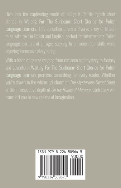 Dive into the captivating world of bilingual Polish-English short stories in Waiting For The Sunbeam: Short Stories for Polish Language Learners. This collection offers a diverse array of fifteen tales with text in Polish and English, perfect for intermediate Polish language learners of all ages seeking to enhance their skills while enjoying immersive storytelling. With a blend of genres ranging from romance and mystery to fantasy and adventure, Waiting For The Sunbeam: Short Stories for Polish Language Learners promises something for every reader. Whether you're drawn to the whimsical charm of The Mysterious Sweet Shop, or the introspective depth of On the Roads of Memory, each story will transport you to new realms of imagination.