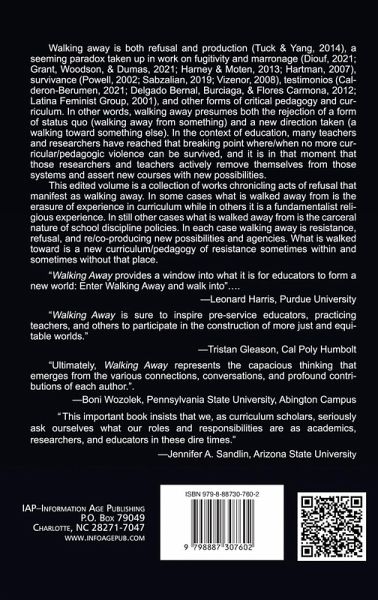 Walking away is both refusal and production (Tuck & Yang, 2014), a seeming paradox taken up in work on fugitivity and marronage (Diouf, 2021; Grant, Woodson, & Dumas, 2021; Harney & Moten, 2013; Hartman, 2007), survivance (Powell, 2002; Sabzalian, 2019; Vizenor, 2008), testimonios (Calderon-Berumen, 2021; Delgado Bernal, Burciaga, & Flores Carmona, 2012; Latina Feminist Group, 2001), and other forms of critical pedagogy and curriculum. In other words, walking away presumes both the rejection of a form of status quo (walking away from something) and a new direction taken (a walking toward something else). In the context of education, many teachers and researchers have reached that breaking point where/when no more curricular/pedagogic violence can be survived, and it is in that moment that those researchers and teachers actively remove themselves from those systems and assert new courses with new possibilities. This edited volume is a collection of works chronicling acts of refusal that manifest as walking away. In some cases what is walked away from is the erasure of experience in curriculum while in others it is a fundamentalist religious experience. In still other cases what is walked away from is the carceral nature of school discipline policies. In each case walking away is resistance, refusal, and re/co-producing new possibilities and agencies. What is walked toward is a new curriculum/pedagogy of resistance sometimes within and sometimes without that place.