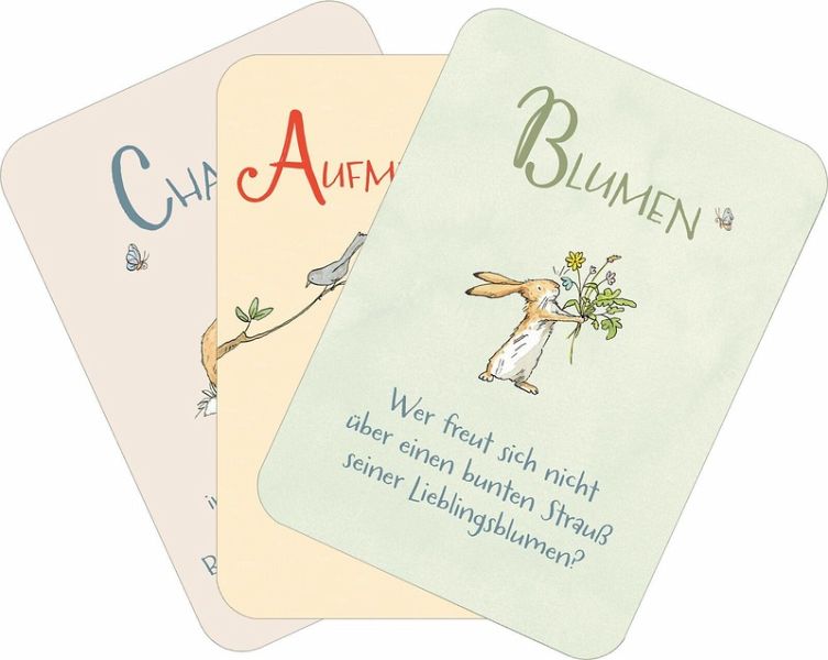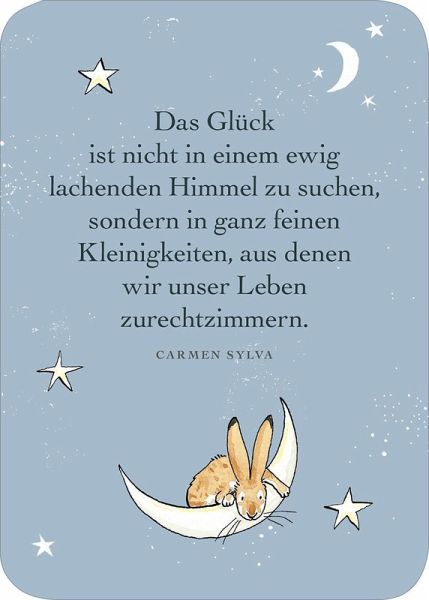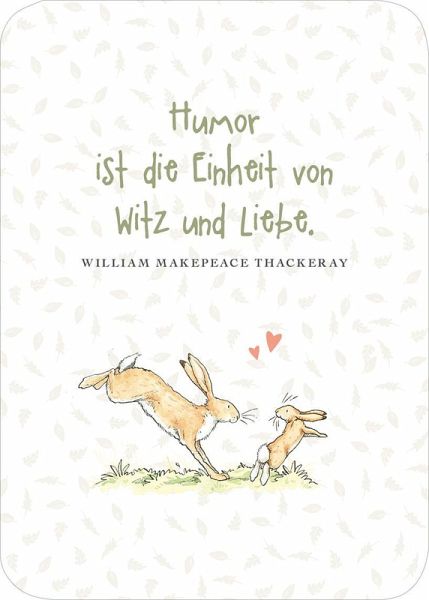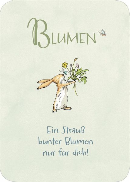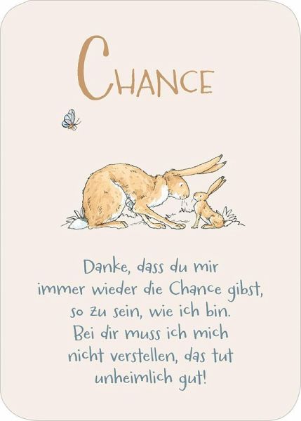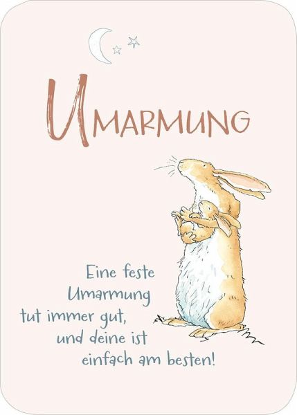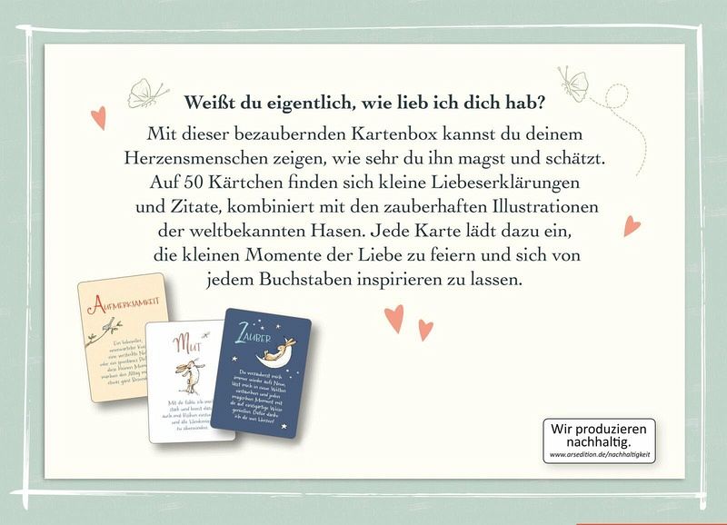 Mit dieser bezaubernden Kartenbox kannst du deinen Herzensmenschen zeigen, wie sehr du sie magst und schätzt. Auf 50 Kärtchen finden sich kleine Liebeserklärungen, Zitate und Anregungen von A wie "Aufmerksamkeit" bis Z wie "Zuneigung", um die Liebe immer wieder neu zu genießen und zu feiern. Die weltbekannten Hasen aus dem Klassiker von Sam McBratney und Anita Jeram bieten dabei den perfekten Rahmen. Die Kärtchen können an Lieblingsmenschen verschenkt werden und sind auch im Regal ein toller Blickfang. Als kleine Aufmerksamkeit für einen bestimmten Anlass oder einfach so, um sich immer wieder neu von der Liebe inspirieren zu lassen.