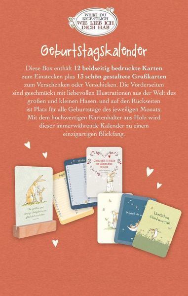 Diese Kartenbox enthält 25 einzigartig gestaltete Karten samt einem hochwertigen Ständer aus Holz, die dein Jahr verschönern. Die 12 Monatskarten mit den zauberhaften Hasen aus "Weißt du eigentlich, wie lieb ich dich hab?" begleiten dich dabei durchs Jahr. Auf der Rückseite jeder Karte kannst du die Geburtstage deiner Lieblingsmenschen festhalten, sodass kein besonderer Tag mehr in Vergessenheit gerät. Der hochwertige Holzständer setzt die Karten dabei wunderschön in Szene. Als besonderes Extra enthält die Box 13 zauberhafte Grußkarten - perfekt, um Geburtstagswünsche oder kleine Herzensbotschaften zu verschicken. Ein Kalender, der verbindet, berührt und Freude schenkt.