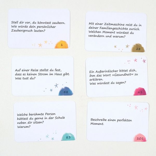 Was wäre wenn? Fantasievoll ins Gespräch kommen- 120 Ideen für den spielerischen Gesprächseinstieg- Gesprächseinstieg, Eisbrecher und Tool für die ExplorationWenn du zaubern könntest, wie würde dein magischer Zauberspruch lauten? Wie lange ist man fremd? Welche Geschichten hätte wohl ein Glücksbringer zu erzählen? Lauter ungewöhnliche Fragen, um mit Kindern ins Gespräch zu kommen.Kreativ Fragen und NachfragenOb in den ersten Stunden einer Psychotherapie, zu Stundenbeginn oder in Gruppen ... Das Kartenset ermöglicht es abseits vom gewohnten »Erzähl doch mal«, Informationen und Perspektiven auf das Problem spielerisch und kreativ zu erheben, vereinfacht das gegenseitige Kennenlernen und den Vertrauensaufbau.- 6 Themen: Glück und Spaß - Freundschaft und Familie - Gesundheit und Wohlbefinden - Schule und Beruf - Fremde und Heimat - Hier und im Netz- Für die therapeutische und pädagogische Arbeit mit Kindern ab 8 Jahren- Im Einzel- und Gruppensetting einsetzbar