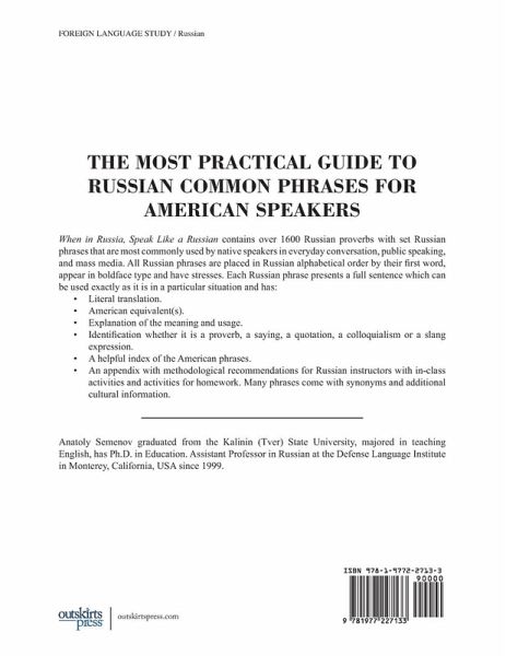 When in Russia, Speak Like a Russian contains over 1600 Russian proverbs with set Russian phrases that are most commonly used by native speakers in everyday conversation, public speaking, and mass media. All Russian phrases are placed in Russian alphabetical order by their first word, appear in boldface type and have stresses. Each Russian phrase presents a full sentence which can be used exactly as it is in a particular situation and has: • Literal translation. • American equivalent(s). • Explanation of the meaning and usage. • Identification whether it is a proverb, a saying, a quotation, a colloquialism or a slang expression. • A helpful index of the American phrases. • An appendix with methodological recommendations for Russian instructors with in-class activities and activities for homework. Many phrases come with synonyms and additional cultural information.
