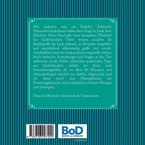 Wie analysiert man ein Gedicht? Zahlreiche OberstufenschülerInnen stellen diese Frage im Laufe ihrer Schulzeit. Dieser Band gibt einen kompakten Überblick zur Gedichtanalyse. Dabei werden zunächst die Basisbegriffe der Lyrik erläutert, an Beispielen vorgeführt und anschließend selbstständig geübt und vertieft. Anschließend wird ein Analyseschema vorgestellt, welches durch zahlreiche Anmerkungen und Fragen an den Text aufbereitet wurde. Neben zahlreichen praktischen Tipps zur Gedichtanalyse enthält der Band auch Formulierungshilfen, die vor allem für Klausuren und Abiturprüfungen nützlich sein dürften. Abgerundet wird der Band durch eine Übungsklausur mit Erwartungshorizont, sowie zahlreichen weiteren Übungen, die alle mit Lösungen versehen wurden.Aus dem Inhalt des Praxishandbuches mit vielen praktischen Übungen, Erläuterungen und Lösungen (inkl. einer ausführlichen Einführung in die Metrik):I. Basisbegriffe: Ausführliche Einführung in alle Basisbegriffe der Lyrik, dazu Übungen zu jedem einzelnen FachwortReimMetrumAuftakt und KadenzStilmittelGedichtformenetc.II. Analyse: Schritt für Schritt zur Analyse mit einem umfangreichen Raster und zahlreichen FormulierungshilfenIII. Übungsklausur mit ErwartungshorizontIV. Lösungen