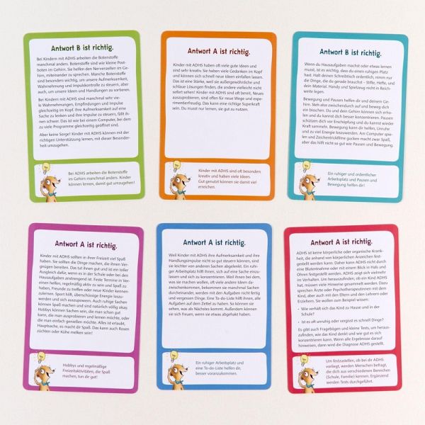 Rätseln, lernen, staunen!- 50 schlaue Quizfragen, die zum Mitdenken anregen- Mit Wilbo, dem pfiffigen Erdmännchen, wird Psychoedukation lebendig- Fördert Selbstreflexion und vermittelt StörungswissenDas lustige ADHS-Quiz für neugierige Köpfe ab 6 JahrenDie Quizkarten zur Psychoedukation helfen Kindern, die Aufmerksamkeitsdefizit/ Hyperaktivitätsstörung (ADHS) zu verstehen. Sie vermitteln humorvoll Wissen zu Symptomen, Ursachen und Behandlungsmöglichkeiten und schaffen so eine perfekte Grundlage für therapeutische Fortschritte.- Spielerische Wissensvermittlung mit Spaßfaktor- Antworten werden kindgerecht erklärt- Ideal für Therapie und Beratung sowie Familienarbeit