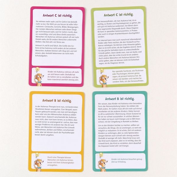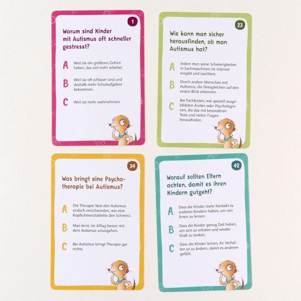 Rätseln, lernen, staunen!- 50 schlaue Quizfragen, die zum Mitdenken anregen- Mit Wilbo, dem pfiffigen Erdmännchen, wird Psychoedukation lebendig- Fördert Selbstreflexion und vermittelt StörungswissenSpannendes Mitmach-Quiz über AutismusAutismus-Spektrum-Störungen (ASS) prägen soziale Interaktion, Verhalten und Wahrnehmung der betroffenen Kinder. Mit spannenden Fragen und spielerisch aufbereitetem Wissen entdecken Kinder mit diesem Quiz, was Autismus bedeutet. Sie lernen, ihre eigenen Besonderheiten besser zu verstehen, setzen sich aktiv mit ihrer Diagnose auseinander und erfahren mehr über mögliche Ursachen sowie hilfreiche Strategien für den Alltag.- Entkräftet typische Mythen, vermittelt Fakten, fördert Verständnis- Für neugierige Köpfe ab 6 Jahren- Vielseitig einsetzbar in Einzel, Gruppen- und Familienarbeit