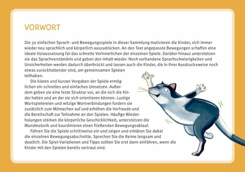 30 Sprachspiele für die Kita, die Bewegung und Sprechen fördernDank der fröhlichen Illustrationen finden auch die Kleinsten ihren LieblingsversSchnell und einfach durchführbar: lustige Fingerspiele, die immer funktionierenStabile Bildkarten mit Reimen, Bewegungsanleitung und VariationenWitzige Mundmotorik-Übungen für Krippe und Kindergarten