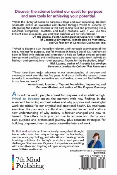 Around the world, people's quest for purpose is at an all-time high. This book meets the moment with new findings about the science of becoming our best selves and why purpose and meaningful work are critical for our physical and emotional health. In Wired to Become, Dr. Andreatta shares the latest scientific findings to craft a new understanding of why society is forever changed. She shares tools you can use to explore and clarify your own sense of purpose and find meaningful work. She also offers several concrete strategies for how we can build purpose-driven organizations, which are the new future of work.
