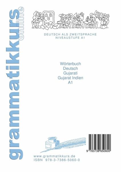 Der A1 - Lektion 1 "Guten Tag" Lernwortschatz enthält zusätzlich zur Übersetzung ins GUJARATI - ENGLISCH folgenden Grammatiken.Substantive/NomenArtikeln (der-die-das)Pluralformen, -endungen und Regeln zur PluralbildungFällen (Nominativ, Genitiv, Dativ, Akkusativ)VerbenInfinitivStammvokalwechsel in verkürzter Form (z.B. a - i - a für fangen - fing - gefangen)Konjugationsnummer: Mit Hilfe dieser Nummer lassen sich alle Verben, die in der alphabetischen Verbliste am Ende des Buches PONS Verbtabellen Plus DEUTSCH aufgelistet sind, dem jeweils entsprechenden Konjugationsmuster zuordnenStammformen: Die meisten Konjugationsformen der unregelmäßigen Verben lassen sich aus diesen drei Stammformen ableiten: 1. Stammform : Infinitiv2. Stammform: 1. Person (ich) Singular Präsens3. Stammform: 1. Person (ich) Singular Präteritum4. Stammform: 1. Person (ich) Perfekt / Partizip IIAngaben überhaben oder seinreflexive VerbformenPräfixen und Trennbarkeit von PräfixenModalverbenBeispiele / Anmerkungen / BesonderheitenAdjektiveSteigerungsformenAntonyme (Gegenteile: hart - weich)Beispiele / Anmerkungen / BesonderheitenSonstige WortartenAdverbien; Interjektionen; Konjunktionen; Numerale; Präpositionenjeweils mit Beispielen, Anmerkungen, Besonderheiten