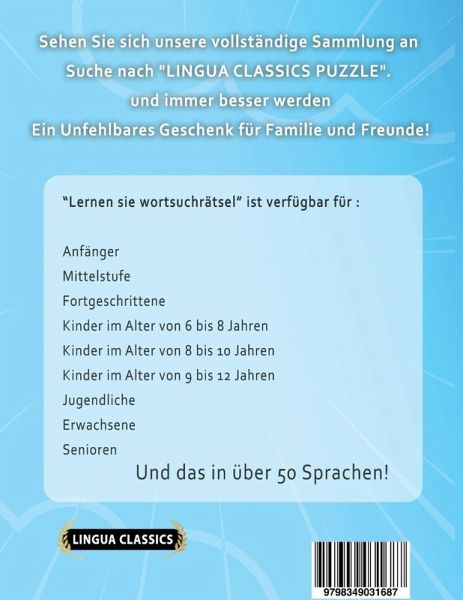 * MOTS MÊLÉS XL GROS CARACTÈRES - Profitez des puzzles les plus faciles à lire sur le marché pour reposer vos yeux. Amusez-vous avec plus de 100 puzzles pour conserver un esprit clair et affuté ! Un CADEAU IDÉAL pour apprendre ou pratiquer une langue. Un livre qui vous offre + de 40 heures de divertissement et d’entrainement intellectuel avec : - 100 GRILLES AU FORMAT A4 : Conçues pour la meilleure lisibilité possible - IMPRIMÉ SUR DU PAPIER HAUTE QUALITÉ : L'encre ne traverse pas (surligneurs ou feutres) - POUR TOUT ÂGE (15-99 ANS) : Plus de 2000 mots sélectionnés avec soin - FEUILLETEZ : Pas de mauvaises surprise, parcourez le livre en cliquant sur la couverture - SOLUTIONS SIMPLIFIÉES : Solutions disponibles dans un format simple et clair - FACILE & INTERMÉDIAIRE : Suffisamment difficile pour s’amuser, et simple pour être divertissant Le Meilleur Choix Pour Entrainer Votre Intellect Et Développer Un Esprit Agile Tout En Vous Amusant ! ------- [ENGLISH] ------- Note: Some content in English might be missing due to length restrictions. * XL WORD SEARCH WITH SUPER LARGE PRINT CLASSIC EDITION - Give Your Eyes a Rest with the Easiest to Read Puzzles on the Market! Entertain your brain with 100 puzzles to keep it sharp and quick! The Ideal Gift to Learn or Practice a Language. With +40 hours of entertainment, this is The Word Search Game you were looking for: - 100 PUZZLES IN FULL PAGE FORMAT: Designed for the best readability possible. - PRINTED ON HIGH QUALITY PAPER: Use highlighters or pens, no bleed through - FUN FOR ALL AGES (15-99 YEARS): Enjoy a curated selection of +2000 words - BOOK PREVIEW AVAILABLE: No surprise, click on the cover to Look inside the book - EASY MATCH SOLUTION: Solutions in a clear and simple format - EASY & INTERMEDIATE LEVEL: Difficult enough to be challenging, easy enough to be addictive Get it now to keep your brain fit and strong while having fun!