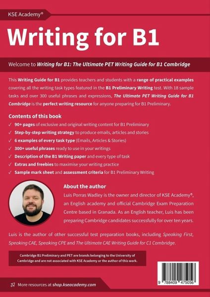 WRITING B1: THE ULTIMATE PET WRITING GUIDE FOR B1 CAMBRIDGE This B1 writing guide covers the writing tasks that appear in the Cambridge test called B1 Preliminary (PET). These tasks are: - Emails - Articles - Stories This book provides 6 sample B1 Preliminary Writing tasks and answers for each type of writing, plus more than 300 useful expressions that candidates can use in their writings for B1 Cambridge. Ideally, students should use these samples as models for their own writing tasks, making use of the helpful phrases provided at the end of each section. CONTENTS OF THIS WRITING PET BOOK - 90+ pages of exclusive and original writing content - Step-by-step writing strategy to produce any type of writing task easily - 6 examples of every task type (emails, articles and stories) - 300+ useful phrases ready to use in your writings - Description of the B1 Writing paper and every type of task - List and explanation of connectors for B1 writing - Extras and freebies to maximise your writing practice - Sample mark sheet and assessment criteria for B1 Preliminary Writing WRITING B1: TASK DESCRIPTION Besides the sample tasks and expressions, this guide also contains: - Description of B1 Writing Part 1 and Part 2 - Full description of every B1 writing task type - Guidance on developing an appropriate writing strategy for each type of task - Explanation of how writing is assessed and a sample mark sheet. WHO'S THIS B1 WRITING GUIDE FOR? In general, this writing guide is aimed at: - Students of English as a foreign language looking to improve their writing abilities in preparation for the B1 Preliminary certificate (formerly known as PET or Preliminary English Test) - EFL Teachers looking for B1 writing support materials to use with their own students. B1 PRELIMINARY WRITING: PARTS 1 & 2 In the two parts of the B1 Preliminary Writing paper, candidates have to show that they can write different types of texts in English. There are two parts, and they have 45 minutes to complete both parts. PET Writing Part 1 Candidates are provided with a message they have received by email. The text is annotated with a set of prompts presented as notes. Candidates have to read and interpret the email and respond to it accordingly. In their answer, they must include the four content points in a response of around 100 words. PET Writing Part 2 Candidates have to write a text from a choice of two text types: article or story. These different types of tasks are designed to provide situations and contexts in which candidates can put together and develop their ideas on a subject, with a specific purpose for writing, target reader and context in mind. THE WRITING PROCESS FOR B1 PRELIMINARY TASKS Thanks to this writing guide, you can now develop your own foolproof writing method. This guide provides you with a step-by-step writing process which you can apply to every B1 writing task you do, from the brainstorming stage to editing and reviewing your final draft. Get your copy now and nail your PET Writing test!