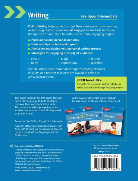 Writing in English at advanced levels involves more than just words and grammar - it requires knowledge of the audience, context, environment and more. Being able to communicate in an appropriate way will help you to make a great impression when you write in English. Using real life examples and language Collins English for Life: Writing (B2+) will help you to sound natural, clear and confident when you write.