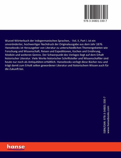 Wurzel-Wörterbuch der Indogermanischen Sprachen, - Vol. II, Part I. ist ein unveränderter, hochwertiger Nachdruck der Originalausgabe aus dem Jahr 1876.Hansebooks ist Herausgeber von Literatur zu unterschiedlichen Themengebieten wie Forschung und Wissenschaft, Reisen und Expeditionen, Kochen und Ernährung, Medizin und weiteren Genres. Der Schwerpunkt des Verlages liegt auf dem Erhalt historischer Literatur. Viele Werke historischer Schriftsteller und Wissenschaftler sind heute nur noch als Antiquitäten erhältlich. Hansebooks verlegt diese Bücher neu und trägt damit zum Erhalt selten gewordener Literatur und historischem Wissen auch für die Zukunft bei.