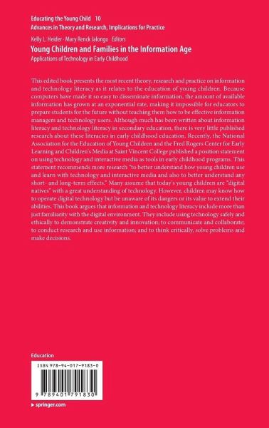 This edited book presents the most recent theory, research and practice on information and technology literacy as it relates to the education of young children. Because computers have made it so easy to disseminate information, the amount of available information has grown at an exponential rate, making it impossible for educators to prepare students for the future without teaching them how to be effective information managers and technology users. Although much has been written about information literacy and technology literacy in secondary education, there is very little published research about these literacies in early childhood education. Recently, the National Association for the Education of Young Children and the Fred Rogers Center for Early Learning and Children's Media at Saint Vincent College published a position statement on using technology and interactive media as tools in early childhood programs. This statement recommends more research "to better understand how youngchildren use and learn with technology and interactive media and also to better understand any short- and long-term effects." Many assume that today's young children are "digital natives" with a great understanding of technology. However, children may know how to operate digital technology but be unaware of its dangers or its value to extend their abilities. This book argues that information and technology literacy include more than just familiarity with the digital environment. They include using technology safely and ethically to demonstrate creativity and innovation; to communicate and collaborate; to conduct research and use information and to think critically, solve problems and make decisions.