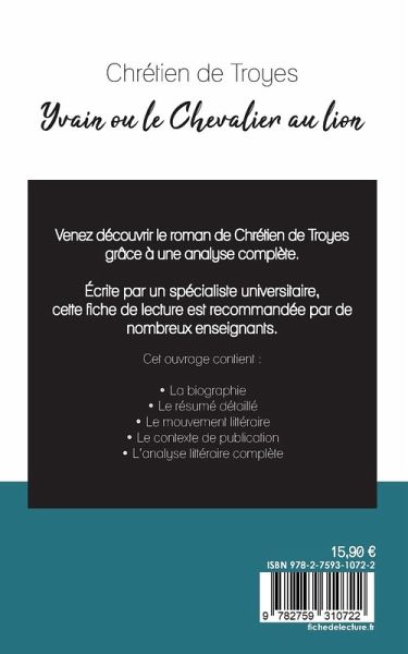 Venez découvrir Yvain ou le Chevalier au lion de Chrétien de Troyes, grâce à une analyse littéraire de référence ! Écrite par un spécialiste universitaire, cette fiche de lecture est recommandée par de nombreux enseignants. Cet ouvrage contient la biographie de l'écrivain, le résumé détaillé, le mouvement littéraire, le contexte de publication de l'oeuvre et l'analyse complète. Retrouvez tous nos titres sur : www.fichedelecture.fr.