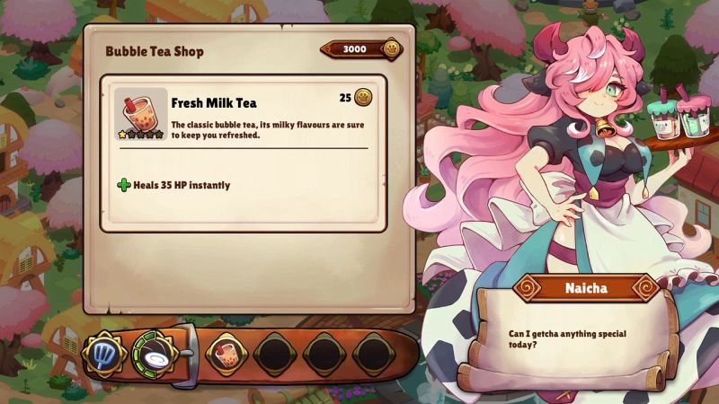 Erlebe Abenteuer in der Welt außerhalb von Paell, setze deine Kochutensilien gegen riesige Hühner, Artilleriegarnelen, feuerspeiende Paprikaschoten und andere lästige Gefahren ein, während du unterwegs Boba schlürfst.