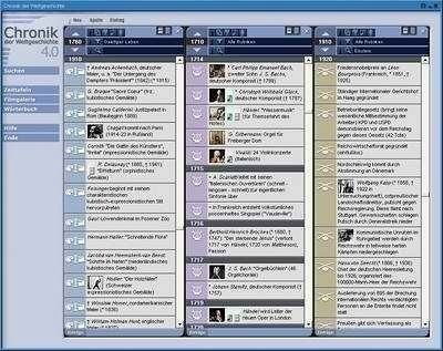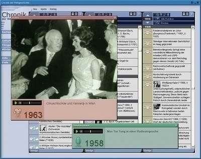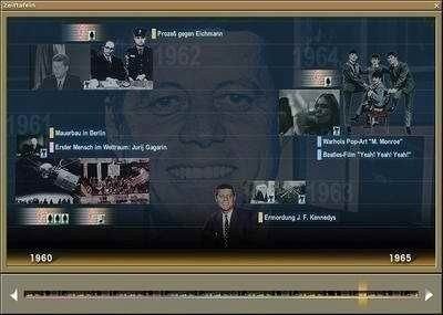 Enthält das komplette Nachschlagewerk dtv Wörterbuch Geschichte Treffsichere Recherche anhand eines frei konfigurierbaren Chronik-Browsers mit mehreren Spalten über sechs Stunden Videomaterial aus Wochenschauen, Spielfilmen etc. Mehr als 58.000 Einträge aus Politik, Literatur, Philosophie, Bildender Kunst, Musik, Wissenschaft und Alltagsleben NEU: Aktualisiert bis 07/2003, neues Bildmaterial