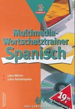 Mit diesem kompakten Wortschatztrainer für Reise, Beruf und Schule können Sie schnell und effektiv Ihren spanischen Wortschatz trainieren und testen. Diese CD-ROM enthält die rund 3800 wichtigsten Wörter der spanischen Sprache, aufgeteilt in Basdis- und Aufbauwortschatz und systematisch nach Sachgebieten geordnet. Ergänzt wird der Wortschatz durch rund 3800 Satzbeispiele. Alle Wörter und Sätze sind vertont. Intelligenter Vokabeltest, Druckfunktion, Lernstatistik und Glossar runden das Programm ab. R Systemvoraussetzungen: S PC 486/60 MHz oder höher, Windows 95/98, NT, mind. 8 MB Arbeitsspeicher, VGA-Grafikkarte, mind. 256 Farben (800 x 600 Bildpunkte), 16-Bit-Soundkarte, mind. double speed CD-ROM-Laufwerk, Maus, Lautsprecher oder Kopfhörer.