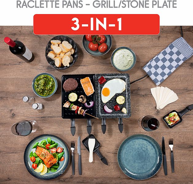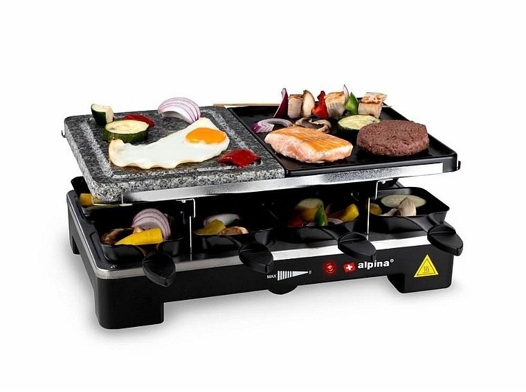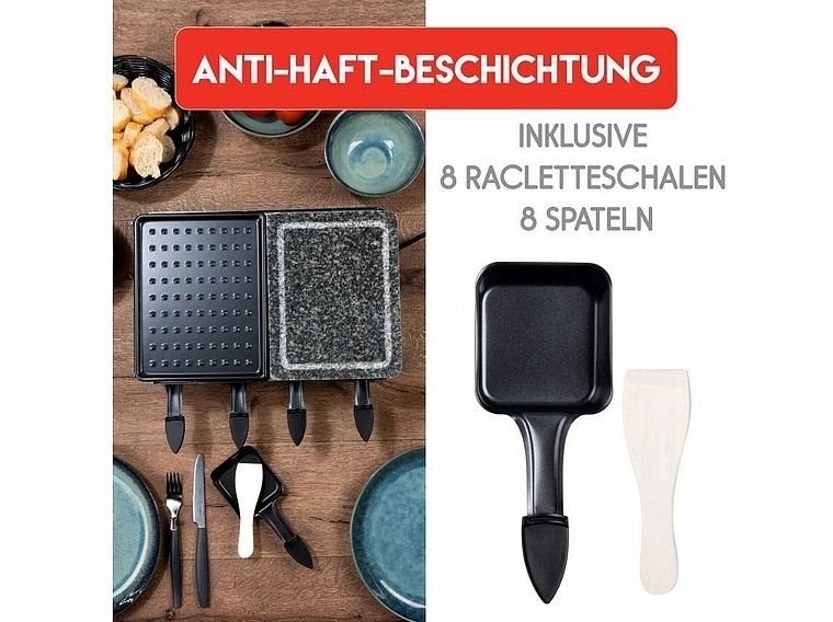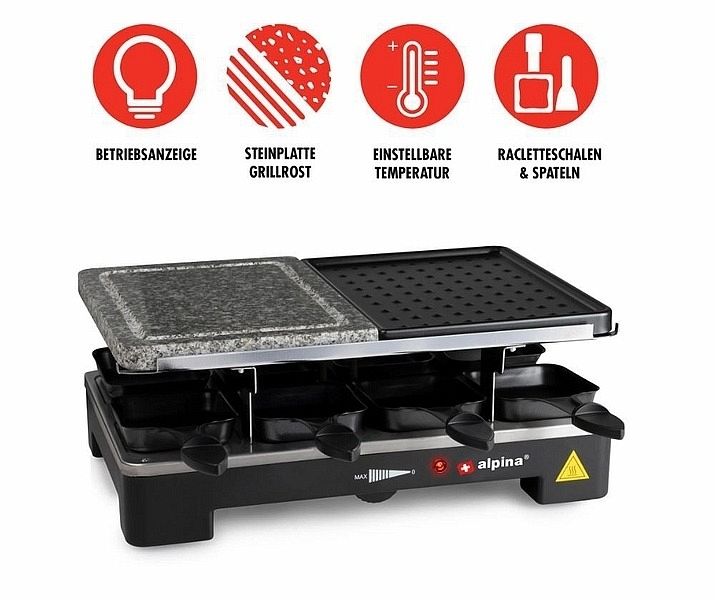 Mit diesem alpina Gourmet-Set mit Pfannen, Steingrill und normalem Grill können Sie eine Gruppe von bis zu 8 Personen begleiten. Gemütlich zu tun mit Freunden, Familie oder der eigenen Familie, zum Beispiel im Urlaub. Steingrill und Pfannen in 2 LagenDas Set besteht aus 2 Schichten. Auf dem Boden ist Platz für 8 Gourmetpfannen. Auf der Oberseite befindet sich ein normaler Grill und eine Grillplatte aus Stein. Diese 2 Platten messen jeweils 18 x 23 Zentimeter. Sie erhalten 8 Minipfannen und 8 Spachtel. Das Aufstellen dieses Gourmet-Sets ist im Handumdrehen erledigt: Stecker in die Steckdose und schon heizt es auf. Das brennende Licht zeigt an, dass das Gerät in Betrieb ist. Sie können die Temperatur mit dem Drehthermostat einstellen. Fleisch, Fisch, vegetarisch oder veganDas Garen in Kombination mit (Stein-)Grillen ist eigentlich sehr einfach. Alles, was Sie tun müssen, ist einkaufen gehen. Bereiten Sie eine Vielzahl von Zutaten vor und jeder macht, was er mag: Fleisch, Fisch, vegetarisch oder vegan; alles ist möglich. Auf die Grillplatte legen Sie die festen, größeren Zutaten, wie z. B. einen kleinen Hamburger, ein Steak, eine Hähnchenbrust, eine Garnele oder ein Stück Lachs. Größere Obst- und Gemüsestücke können auch auf der Grillplatte gebraten werden. Kleinere oder flüssige Zutaten können in die Pfannen gegeben werden. Denken Sie zum Beispiel an gehackte Zwiebeln, eine Scheibe Käse zum Überbacken von etwas, ein Ei oder einen Pfannkuchen. Soziales Essen Gourmets werden auch als "Social Dining" bezeichnet. Es ist also viel geselliger für den Gastgeber oder die Gastgeberin, die nicht stundenlang in der Küche stehen müssen, um das Essen zuzubereiten. Fertig mit Gourmets? Dann lassen Sie das Raclette-Set natürlich abkühlen, bevor Sie mit der Reinigung beginnen. Reinigen Sie die Backbleche mit einem feuchten, weichen Tuch.