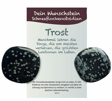 Persönlicher Wunschstein Schneeflockenobsidian-Trost , Schöner, flacher Edelstein, liegt gut in der Hand. Ideal auch zum Tragen in der Hosentasche mit Erklärungskarte.