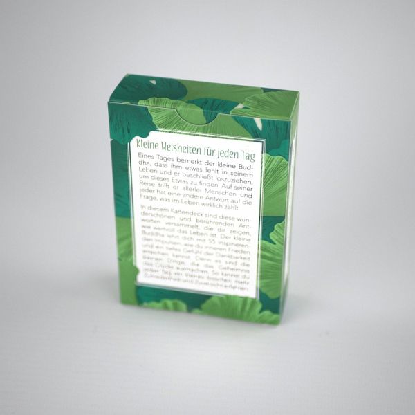 Eines Tages bemerkt der kleine Buddha, dass ihm etwas fehlt in seinem Leben und er beschließt loszuziehen, um dieses Etwas zu finden. Auf seiner Reise trifft er allerlei Menschen und jeder hat eine andere Antwort auf die Frage, was im Leben wirklich zählt. In diesem Kartendeck sind diese wunderschönen und berührenden Antworten versammelt, die dir zeigen, wie wertvoll das Leben ist. Der kleine Buddha lehrt dich mit 55 inspirierenden Impulsen, wie du inneren Frieden und ein tiefes Gefühl der Dankbarkeit erreichen kannst. Denn es sind die kleinen Dinge, die das Geheimnis des Glücks ausmachen. So kannst du jeden Tag ein kleines bisschen mehr Zufriedenheit und Zuversicht erfahren.