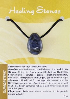 "Healing Stones Edelsteinanhänger" VE 2 Stück Größe des Steins: 3cm Karte: 14x10 cm Von Hand gefertigte, hochwertige Edelstein-Anhänger aus verschiedenen Edelsteinsorten, jeweils eingetütet mit Seidenband und Erklärungskarte. - vielseitige Wirkung (siehe Abbildung) - angenehm zu tragen - hochwertige Qualität der Edelsteine Edelsteinsorten: Türkis, Aquamarin, Streifenachat rot, Iolith, Bernstein, Citrin, Chrysopras, Labradorit, Feuerachat, Magnesit, Pyrit, Rubin, Smaragd, Tektit, Heliotrop, Mondstein, Prehnit, Rosenquarz, Schoerl, Ammonit, Granat, Lapis Lazuli, Ocean Jaspis, Fluorit, Amethyst, Peridot, Chalcedon, Gagat, Rhodochrosit, Botswana Achat, Rubin Zoisit, Dumortierit, Bronzit, Versteinertes Holz, Sonnenstein, Shivas Auge, Onyx, Apatit, Charoit, Chrysokoll, Jade, Rauchquarz, Selenit, Chakra.