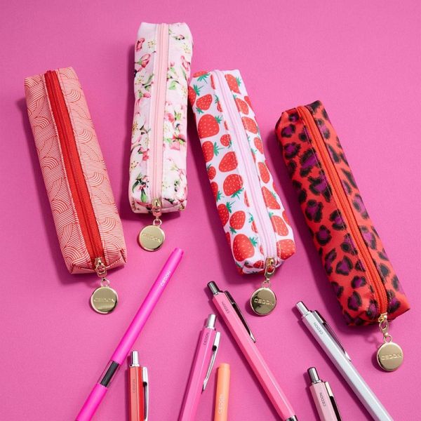 Stiftemäppchen aus hochwertigem Polyestergewebe recycled PET mit farbigem Innenfutter und einem goldenen runden Reißverschlussanhänger. Größe: 19 x 6 x 4 cm