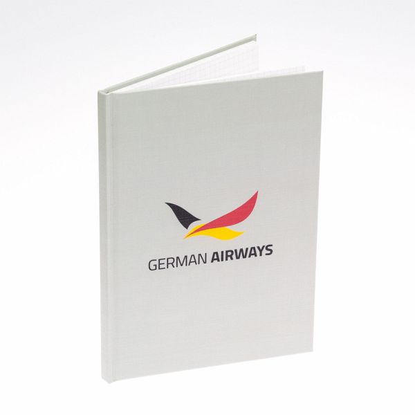 Das hochwertige Hardcover Notizbuch überzeugt im schlichten Design. Auf dem Cover befindet sich das German Airways Logo. Im Notizbuch sind 100 karierte Seiten im Format DIN A5 enthalten, die ausreichend Platz für Notizen und Ideen bieten. Die Notizbücher sind vielseitig einsetzbar und können aufgrund der kompakten Größe einfach verstaut werden.