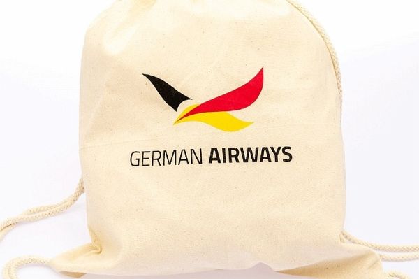 Auf der Vorderseite des Turnbeutels prangt das German Airways Logo. Die Zugbänder des Beutels sind verknotet, sodass die Länge der Träger nach den eigenen Bedürfnissen anpassbar ist. Dementsprechend ist die Tasche für Groß und Klein geeignet. Aufgrund der geknoteten Kordel ist der Turnbeutel zudem besonders stabil. Er ist besonders umweltfreundlich aufgrund der Herstellung aus Baumwolle. Die Maße betragen 37,5 x 46 cm.