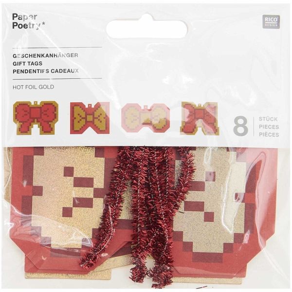 Passend zur Kollektion "Put a Bow on It" können Sie Ihre Geschenke mit den hübschen Schleifenanhängern verzieren. Im Lieferumfang sind 8 Stück mit je 4 Designs enthalten, die eine glänzende Hot Foil-Veredelung zieren. Werden Sie beim Geschenke Verpacken kreativ und machen Ihren Liebsten eine Freude!