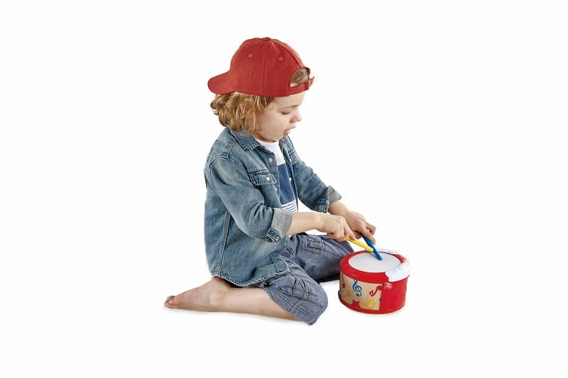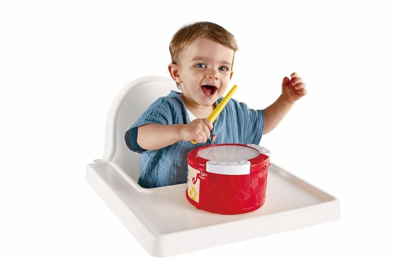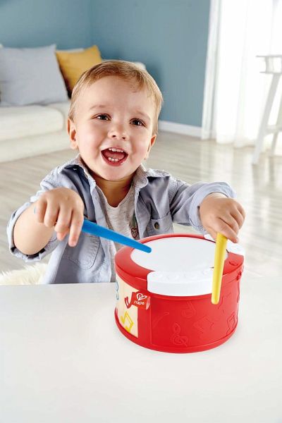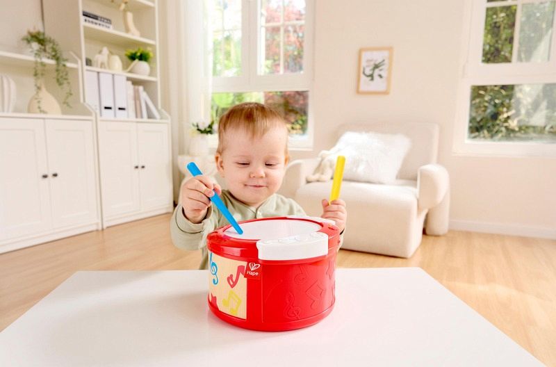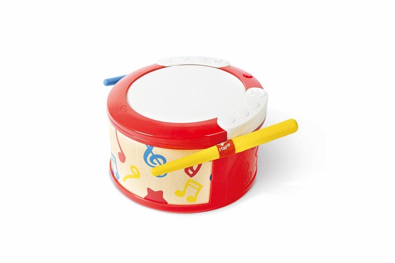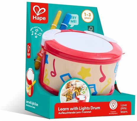 Die Lern-Spiel-Trommel verfügt über einen Rhythmusmodus mit Lichtern und sechs Grundschlägen zum Üben. Außerdem integriert: fünf Melodien zum Mitspielen.