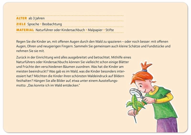 In diesem Bildkarten-Set finden ErzieherInnen, Tageseltern, PädagogInnen und Eltern viele verschieden Anregungen und Spielideen, um mit Kindern ein Projekt zum Thema Wald umzusetzen. Auf den Vorderseiten der Bildkarten wird ein passendes kindgerechtes Bild und ein Foto zur Aktion abgebildet, auf den Rückseiten findet sich eine Beschreibung der jeweiligen Idee.