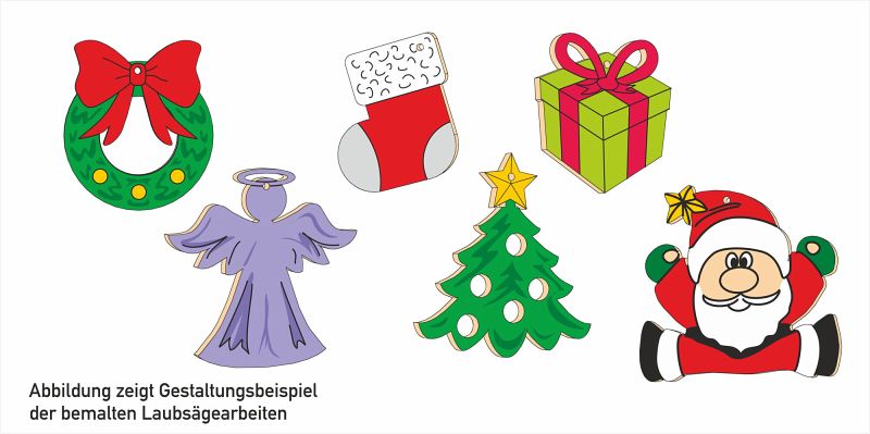 Die schönste Zeit des Jahres wird noch schöner mit diesen Laubsägevorlagen! Zum Basteln eines Mobiles, als Fensterdeko oder als Schmuck für den Weihnachtsbaum: Sechs ansprechende Vorlagen, die nach Belieben bemalt und verschönert werden können. Laubsägearbeiten bieten nicht nur stundenlangen Bastelspaß, sie fördern auch die Entwicklung und Verbesserung in den Bereichen Konzentration und motorische Fähigkeiten. Packungsinhalt: - Laubsägevorlagen aus 3mm Pappelsperrholz - Kranz - Weihnachtsmann - Tannenbaum - Engel - Strumpf - Geschenk - Bild der bemalten Modelle - Allgemeine Tipps und Hinweise zu Laubsägearbeiten - eMail-Link an den Support für Fragen, die beim Bau auftreten können Laubsägearbeiten bieten nicht nur stundenlangen Bastelspaß, sie fördern auch die Entwicklung des Kindes in den Bereichen Konzentration und motorische Fähigkeiten.