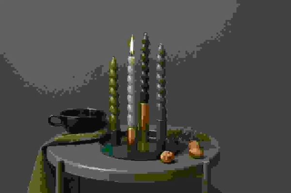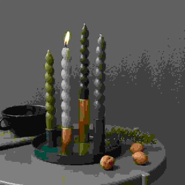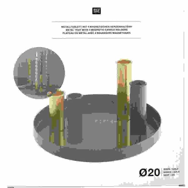 Dieses Metalltablett mit vier magnetischen Kerzenhaltern bietet eine stilvolle und vielseitige Möglichkeit, Kerzen zu präsentieren. Die Halter lassen sich individuell auf dem Tablett anordnen und ermöglichen kreative Gestaltungsmöglichkeiten. In Kombination mit weiteren Dekorationselementen entsteht ein einzigartiges Arrangement für verschiedene Anlässe. Das schlichte und moderne Design macht es zu einem vielseitigen Wohnaccessoire. - Metalltablett mit 4 magnetischen Kerzenhaltern - geeignet für Kerzen Ø 2,1 cm - Maße: Ø 20cm