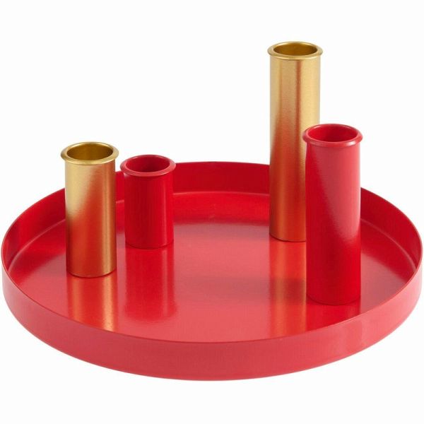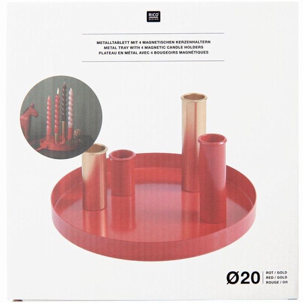 Dieses Metalltablett mit vier magnetischen Kerzenhaltern bietet eine stilvolle und vielseitige Möglichkeit, Kerzen zu präsentieren. Die Halter lassen sich individuell auf dem Tablett anordnen und ermöglichen kreative Gestaltungsmöglichkeiten. In Kombination mit weiteren Dekorationselementen entsteht ein einzigartiges Arrangement für verschiedene Anlässe. Das schlichte und moderne Design macht es zu einem vielseitigen Wohnaccessoire. - Metalltablett mit 4 magnetischen Kerzenhaltern - geeignet für Kerzen Ø 2,1 cm - Maße: Ø 20cm