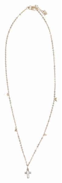 Eine zauberhafte Geschenkidee für Mädchen zur Erstkommunion. Die modisch designte Metall-Kette "Möge Segen dich begleiten" passt mit einer Länge von 43 Zentimetern und einem verstellbaren Verschluss an jeden Hals. In Kombination mit dem schönen Kreuz-Anhänger wird diese Kette in der trendigen Farbe Gold zu einem einzigartigen Schmuckstück, das bewundernde Blicke auf sich zieht. Das in allen Teilen in dem beliebten Farbton Gold arrangierte Ensemble überzeugt mit einer harmonischen Optik.Der Anhänger in Form eines Kreuzes hat die Höhe von 1 Zentimeter. Die raffinierten filigranen Plättchen sorgen für exklusive Glitzereffekte bei jedem Lichtschein. Die Metall-Kette mit dem attraktiven Anhänger wird in der optisch ansprechenden Geschenkverpackung geliefert. Das Motto der Kette "Möge Segen dich begleiten" ist auf der Verpackung aufgedruckt.Die nickelfreie Legierung ist für Allergiker geeignet und erfüllt die hohen Anforderungen der REACH Verordnung.Die Verpackung ist zudem als hochwertige Geschenk-Verpackung verwendbar.