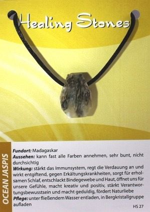 "Healing Stones Edelsteinanhänger" VE 2 Stück Größe des Steins: 3cm Karte: 14x10 cm Von Hand gefertigte, hochwertige Edelstein-Anhänger aus verschiedenen Edelsteinsorten, jeweils eingetütet mit Seidenband und Erklärungskarte. - vielseitige Wirkung (siehe Abbildung) - angenehm zu tragen - hochwertige Qualität der Edelsteine Edelsteinsorten: Türkis, Aquamarin, Streifenachat rot, Iolith, Bernstein, Citrin, Chrysopras, Labradorit, Feuerachat, Magnesit, Pyrit, Rubin, Smaragd, Tektit, Heliotrop, Mondstein, Prehnit, Rosenquarz, Schoerl, Ammonit, Granat, Lapis Lazuli, Ocean Jaspis, Fluorit, Amethyst, Peridot, Chalcedon, Gagat, Rhodochrosit, Botswana Achat, Rubin Zoisit, Dumortierit, Bronzit, Versteinertes Holz, Sonnenstein, Shivas Auge, Onyx, Apatit, Charoit, Chrysokoll, Jade, Rauchquarz, Selenit, Chakra.