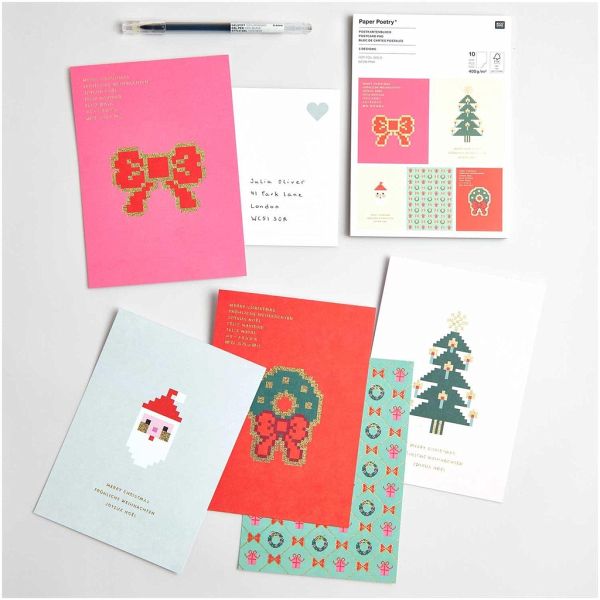 Die Kollektion "Put a Bow on It" stimmt mit fröhlichen Designs auf das Weihnachtsfest ein! Die Pixel Designs mit Schleifen, einem Tannenbaum, Weihnachtskränzen und Nikolaus verbreiten umgehend eine weihnachtliche Stimmung. Mit diesen auf die Themenwelt abgestimmten Postkarten können Sie ganz einfach einen Weihnachtsgruß verschicken. Durch die Hot Foil Details wirken die Karten besonders edel. Im Postkartenblock sind 10 Karten mit 5 verschiedenen Designs enthalten, die auf der weißen Rückseite viel Platz für liebe Worte bieten.