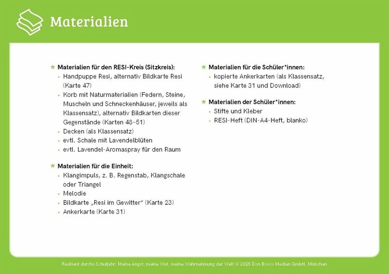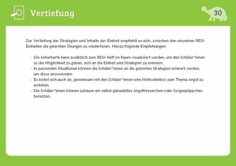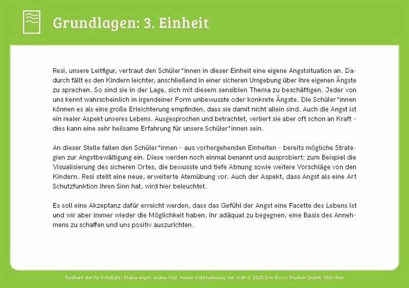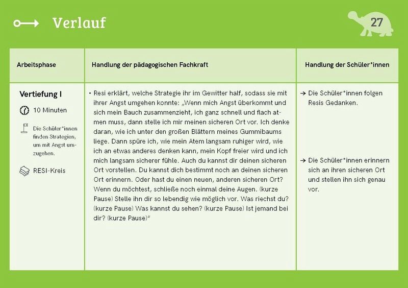 Die vier Lerneinheiten "Mit meiner Wahrnehmung der Welt zuwenden", "Meine Wut - annehmen und bewusst steuern", "Meine Angst - mit dem Atem beruhigen" und "Für Umbruchsituationen offen sein" sind für jeweils 90 Minuten konzipiert. Schritt für Schritt (und mit tatkräftiger Hilfe von Resi!) üben Kinder im Grundschulalter den bewussten Umgang mit ihren Emotionen. Wut und Angst zu verstehen und in Bahnen zu lenken, ist ein wichtiges Ziel der Resilienz-Übungen.