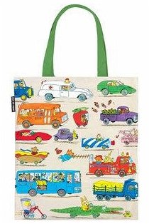Cars and Trucks and Things That Go tote bag - It's time to start your engines in this Richard Scarry classic all about vehicles. Buckle-up for a fun-filled day of planes, trains, automobiles ... and even a pickle truck! Featuring hundreds of clearly labeled vehicles, this is the perfect book for little vehicle fans from the one and only Richard Scarry. Product Details ¿ 100% cotton canvas ¿ Inner pocket ¿ Flat tote ¿ 15" w x 17" h ¿ 11" strap (hanging) ¿ Made in the USA
