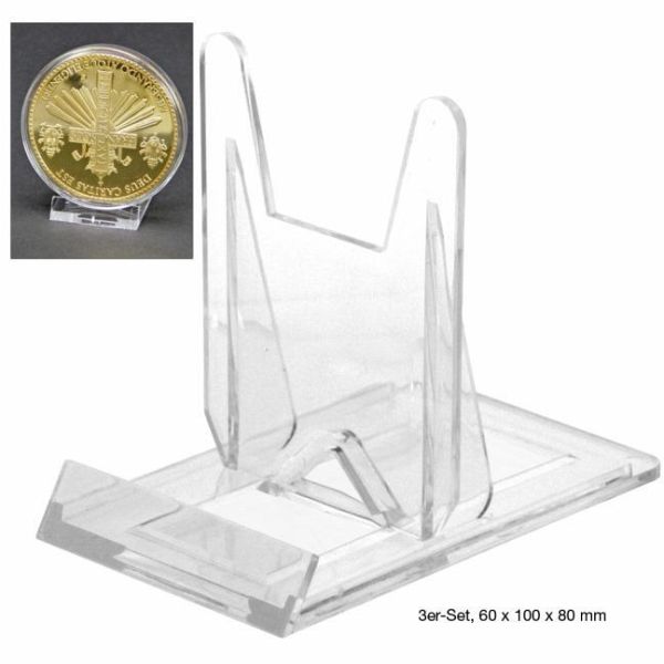 Aus transparentem Kunsstoff. Der senkrechte Teil des Ständers kann je nach Ausstellungsstück verschoben werden.