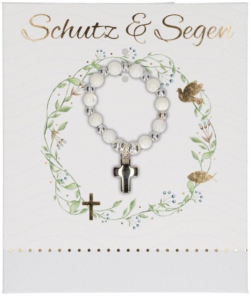 Das Strech-Armband "Schutz und Segen" hat einen Innendurchmesser von ca. 3,2 cm. Das Armband besteht aus weißen Glasperlen, Rosenperlen aus Metall und filigranem Kreuz-Anhänger aus Metall. Das Kreuz ist ein religiöses Symbol und damit ein Zeichen für Jesus und seine nie endende Liebe zu uns Menschen.Das Taufarmband dient als Symbol des christlichen Glaubens und ist ein schönes und bedeutungsvolles Geschenk zur Taufe, ob von den Eltern selbst oder den Paten. Dieses Armband soll den Täufling stets daran erinnern, dass Jesus immer für ihn das ist und sein Segen ihn begleitet.