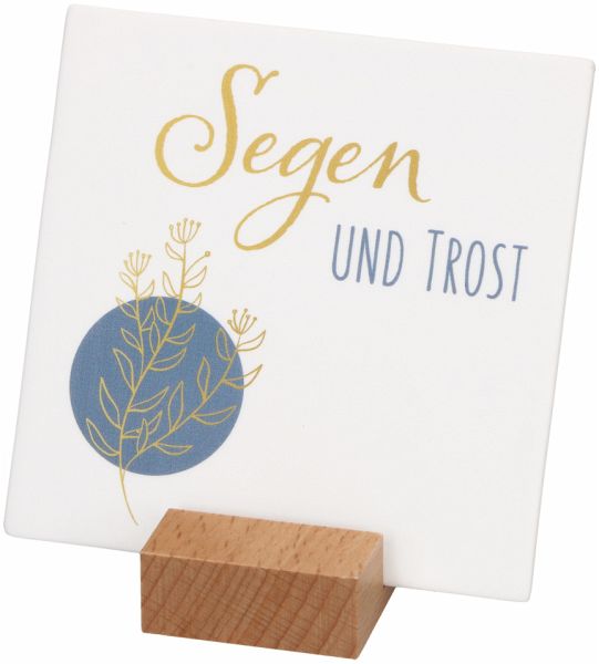 Diese fein gestaltete Porzellan-Tafel ist ein stilles Zeichen der Anteilnahme und Hoffnung. Mit dem liebevoll gestalteten Spruch Segen und Trost schenkt sie in schweren Zeiten ein Gefühl von Nähe und Mitgefühl.Die farbig bedruckte Tafel (10 x 10 cm) wird von einem eleganten Sockel aus Buchenholz getragen und lässt sich einfach aufstellen - ob auf dem Tisch, dem Sideboard oder an einem stillen Gedenkplatz.Geliefert auf einer stilvollen Backcard, eignet sich dieses PorzellanMoment ideal als kleines Geschenk bei Trauer, als Ausdruck des Beileids oder als bleibende Erinnerung.