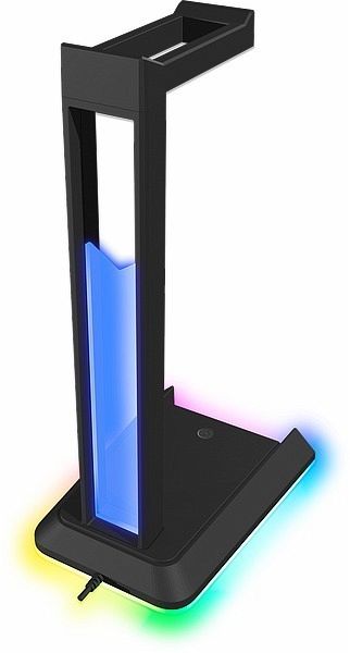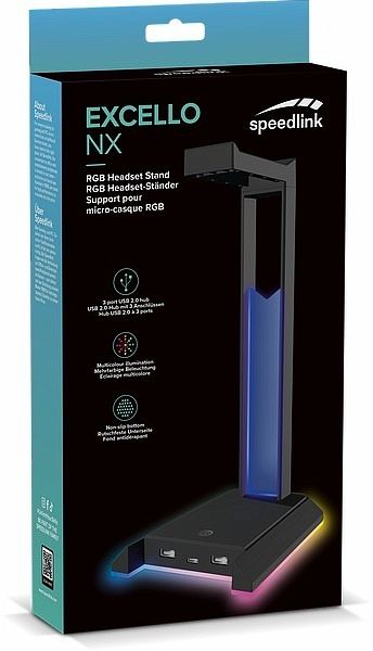 Der EXCELLO NX RGB Headset Stand ist eine praktische sowie stylishe Lösung für jedes Gaming-Setup. Sein platzsparendes Design sorgt dafür, dass Ihr Headset immer griffbereit ist, ohne Unordnung oder lästigen Kabelsalat zu verursachen. Darüber hinaus schafft die mehrfarbige RGB Beleuchtung, die sich bequem über einen Touch-Sensor steuern lässt, eine angenehme Atmosphäre mit verschiedenen Beleuchtungsmodi (Beleuchtung abschaltbar). Zudem ermöglicht der integrierte USB-Hub das Anschließen von bis zu drei weiteren Geräten (1x USB-C und 2x USB-A). Dank der rutschfesten Unterseite steht der EXCELLO NX auch auf glatten Oberflächen jederzeit sicher und fest.