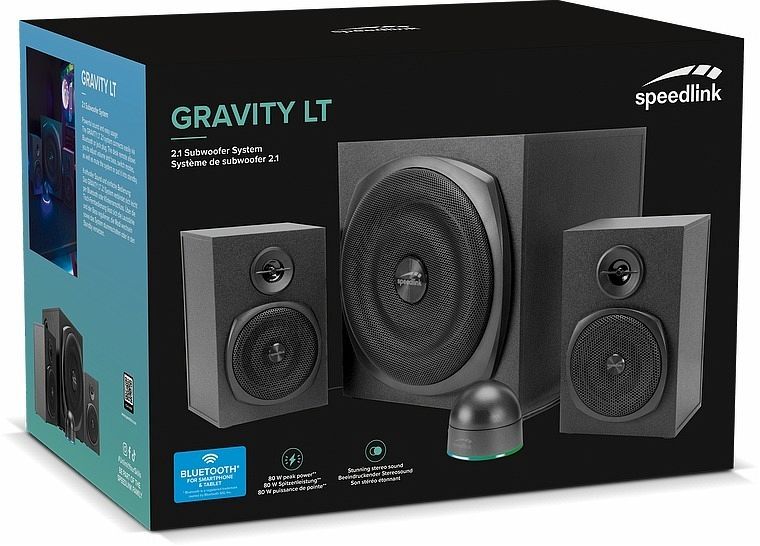 Das GRAVITY LT 2.1-Lautsprechersystem bietet ein kraftvolles Klangerlebnis und ist somit ideal für PC-Enthusiasten sowie Notebook-Benutzer geeignet. Mit seinem leistungsstarken Subwoofer und präzise abgestimmten Satelliten liefert es beeindruckende Audioperformance. Das System verbindet sich mühelos via Bluetooth oder Klinkenanschluss mit verschiedenen Medienquellen. Dank der komfortablen Tisch-Fernbedienung können die Lautstärke und der Bass angepasst, die Modi gewechselt sowie das System mit einem Knopfdruck stummgeschaltet oder in den Standby-Modus versetzt werden. Perfekt geeignet für…mehr