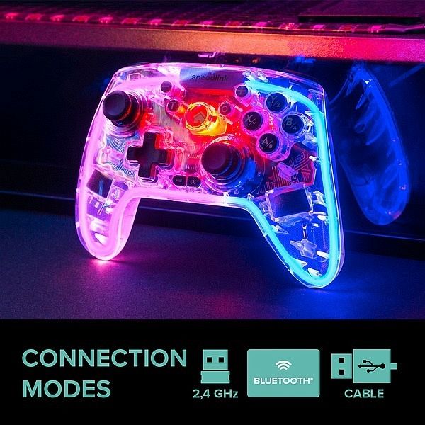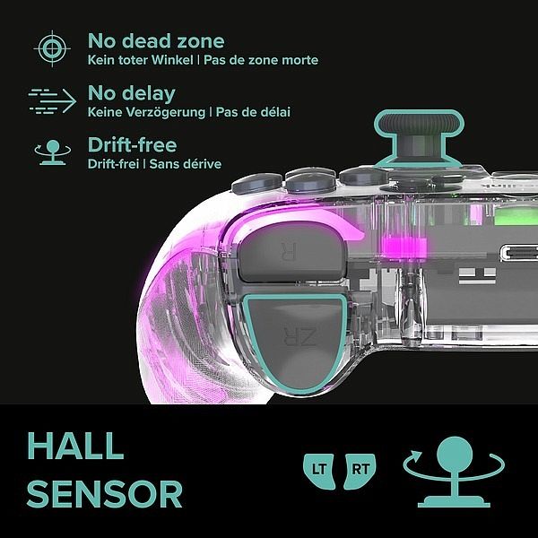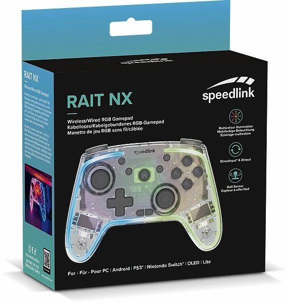 Das kabellose Rait NX Gamepad besticht nicht nur durch seine beeindruckende, transparente Optik und die stylische RGB-Beleuchtung, sondern auch durch modernste Hall-Sensor-Technologie in den Analogsticks und den Triggern für präzise Kontrolle. Ob auf PC, PS3®, Nintendo Switch® oder Android dank außergewöhnlicher Vielseitigkeit und robuster Verarbeitung setzt das RAIT NX neue Maßstäbe in Sachen Performance und Spielerlebnis. Ultimative Flexibilität bietet die Kompatibilität mit DirectInput® und XInput sowie die Verbindung wahlweise über Bluetooth, Funk oder Kabel. Der wiederaufladbare eingebaute 600mAh-Li-Ion-Akku liefert langanhaltende Power, sodass dem Spielvergnügen keine Grenzen gesetzt sind.Die doppelte Vibration garantiert ein immersives Spielerlebnis. Auf den beiden zusätzlichen programmierbaren Tasten auf der Unterseite lassen sich Makros speichern. Gaming in einem neuen Licht mit dem RAIT NX Wireless Gamepad wird jedes Spiel zu einem unvergesslichen Erlebnis!