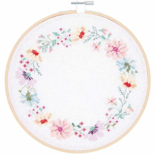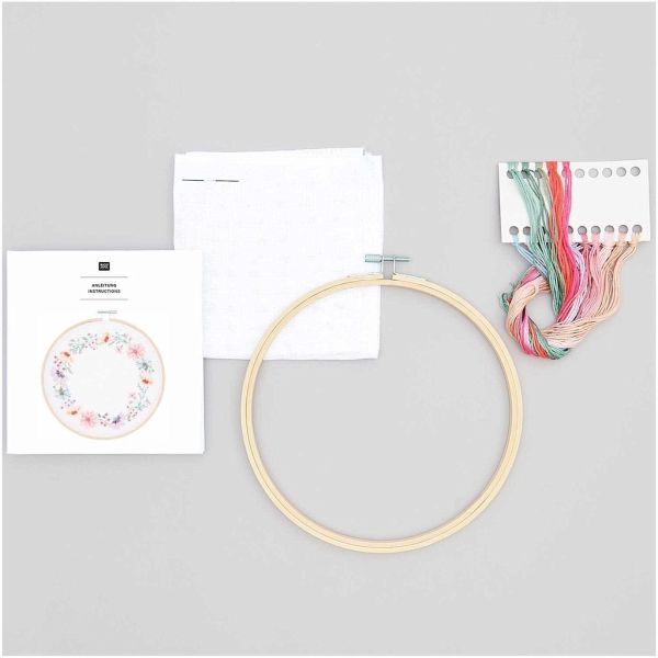 Mit dieser Stickpackung zaubern Sie einen hübschen Blumenkranz. Die Packung enthält einen Zählstoff, Stickgarn, einen Stickring, eine Sticknadel und eine Stickanleitung.